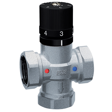 Триходовий змішувальний клапан Far Termo 3950 – це автоматичний прилад терморегулювання системи водопостачання, що дозволяє встановити необхідну температуру води та підтримувати в автоматичному режимі постійну температуру на виході змішаної води.