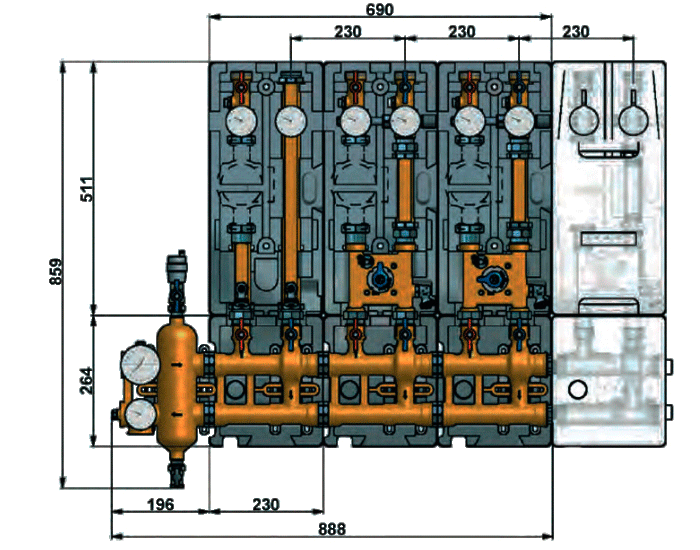 Модульний колектор для котельного розведення має заводський теплоізоляційний кожух і додаткових робіт з теплоізоляції вузлів не потрібно.