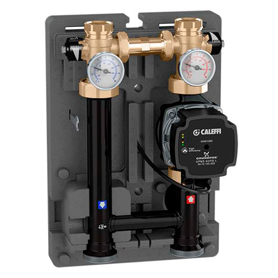 Насосна група прямого розподілу високотемпературного контуру Caleffi 165 – це розподільний модуль, який застосовується для опалювальних петель радіаторного опалення та використовується для забезпечення безперебійної циркуляції теплоносія за системою з необхідною температурою.