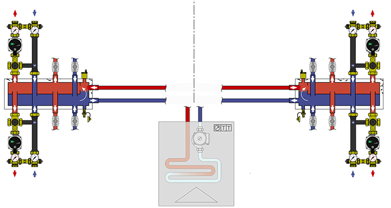 Насосна група термостатичної регуляції укомплектована триходовим змішувальним термостатичним клапаном з вбудованим температурним датчиком, термометрами на подачі і обратке, клапанами-відсікачами вторинного контуру і ізоляційним кожухом.