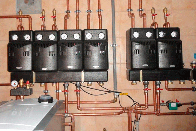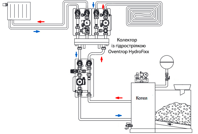 Колектор дозволяє оптимізувати розподіл теплового потоку від котла таким чином, щоб враховувати кількість теплоносія та теплову потужність кожного індивідуального споживання. А гідрострілка стабілізує тиск при різних витратах в основному контурі від котла та вторинними контурами системи опалення (батареї, водяна тепла підлога, водонагрівачі та ін.). За допомогою гідрострілки можна повністю усунути їхній вплив один на одного, забезпечивши роботу кожного контуру в заданому режимі з необхідними параметрами.