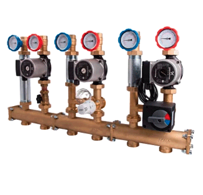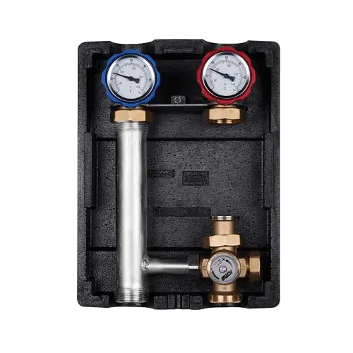 Насосна група термостатичної регуляції укомплектована триходовим змішувальним термостатичним клапаном з вбудованим температурним датчиком, термометрами на подачі і обратке, клапанами-відсікачами вторинного контуру і ізоляційним кожухом.