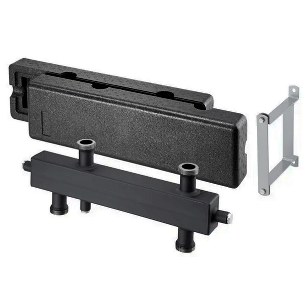 Гідравлічний розподільник Овентроп виготовлений у прямокутному корпусі з чотирма приєднувальними різьбовими виходами різної конфігурації: два призначені для підключення трубопроводів від джерела нагріву та два для підключення розподільного колектора.
