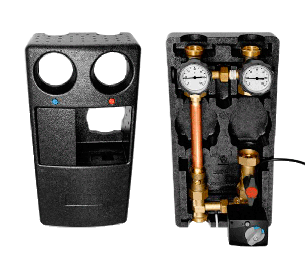 Комплектація складається із запірного вузла з 2 кульовими кранами та 2 термометрами (без байпасу), 1 зворотного клапана, 1 триходового змішувача із сервомотором, теплоізоляційного короба.
