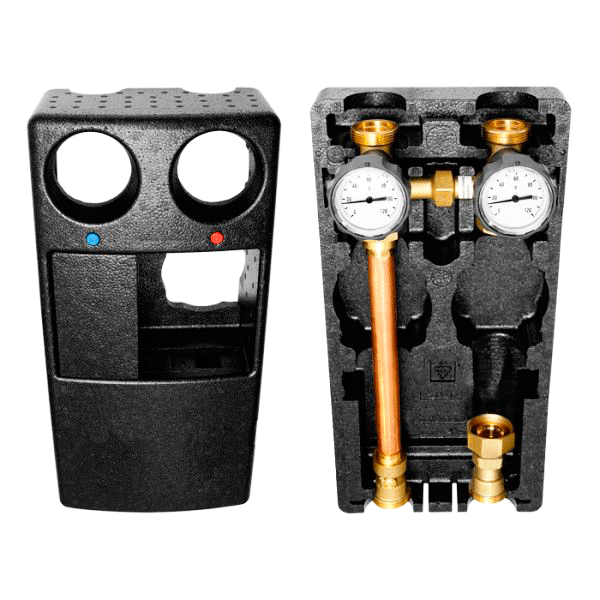Комплектація складається із запірного вузла з 2 кульовими кранами і 2 термометрами (без байпасу), 1 зворотного клапана, 1 подовжує вставки, теплоізоляційного короба.