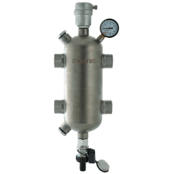 Гідрострілка з нержавіючої сталі для підключення котла Valtec VT.VAR05.SS.06 – це обладнання для комплектації котельних та теплових пунктів, завдання якого полягає в розділенні котлового та опалювальних контурів у системах теплопостачання та ГВП. Гідравлічний розподільник є колектором з малим перепадом тисків між трубопроводами, що приєднуються. Завдяки збільшенню діаметра потоку, його швидкість зменшується таким чином, що лінійні втрати в розподільнику знижуються на 2 порядки, порівняно з втратами в трубопроводах, що підводять.