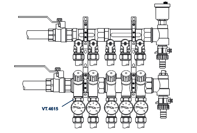 Трійник Valtec VT.4615 виготовлений з гарячепресованої латуні, покритий нікелем, термометр Valtec VT.0617 з діаметром корпусу 41 мм, діапазоном шкали температури, що відображається від 0 до 120 ºС, і похибкою вимірювань - 3 %, застосовуваний матеріал для ущільнень – син DM. Встановлюється як на падаючий, так і зворотний колектор.