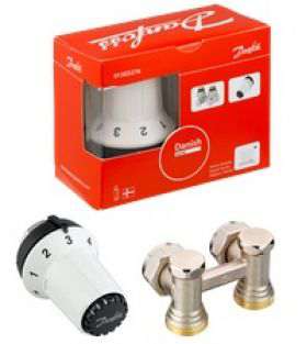 Danfoss 013G5278 комплект для нижнього підключення кутового радіатора – це повністю готовий набір опалювальної арматури, який дозволяє підключати трубопроводи до радіаторів з нижнім підключенням у двотрубних системах при горизонтальній розводці.