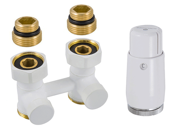 Радіаторний комплект виконаний у білому кольорі, і підходить для підключення різних дизайнерських радіаторів або рушникосушок.