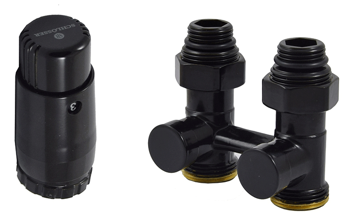 Прямий комплект у чорному кольорі для нижнього підключення радіатора Schlosser 600800066.RAL90051 – це набір арматури для перекриття теплоносія та елемента терморегулювання, що дозволяє підключити труби, що виходять із підлоги, до різних опалювальних батарей. Регулювальні крани для радіаторів опалення Schlosser використовують для монтажу опалювальних приладів у двотрубних системах при горизонтальному розведенні трубопроводів, а покриття чорного кольору покращує дизайнерський естетичний вигляд.