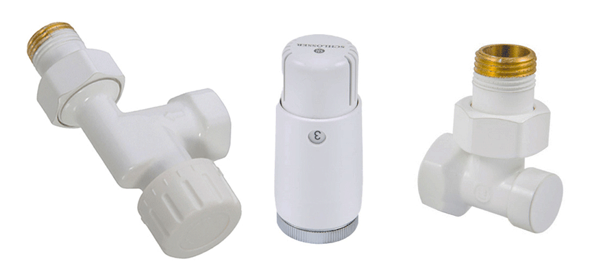 Осьовий комплект для бокового підключення радіатора в білому кольорі Schlosser Standart Mini 602200126 - це набір терморегулюючої та запірної арматури, що дозволяє підключити труби, що виходять зі стін, до різних опалювальних батарей і рушникосушок. Регулювальні крани для радіаторів опалення Schlosser використовують для монтажу опалювальних приладів у двотрубних системах при горизонтальному розведенні трубопроводів.