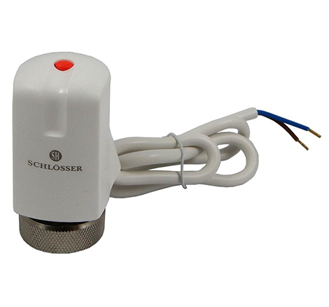 Сервопривід для опалення (теплої підлоги) нормально закритий NC Schlosser - це елемент автоматичного регулювання температури повітря, який призначений для передачі сигналу з кімнатного термостата (контролера) 220В на термостатичний клапан радіатора, внутрішньопідлогового конвектора з різьбленням М30х1,5. При цьому здійснюється зменшення або збільшення кількості теплоносія, що надходить до опалювального приладу, в результаті відбувається підтримка необхідної температури в приміщеннях.