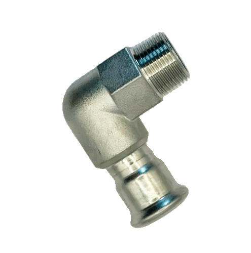 Прес-фітинг з нержавіючої сталі AISI 304 куточок з переходом на зовнішнє різьблення Isotubi – це металопрокатний вид сантехнічного обладнання, який має високий відсоток вмісту хрому (мінімум 18%), а додані до складу нержавіючої сталі нікель, титан, мідь та кремній значно покращують фізичні та хімічні властивості нержавіючих фітінгів. Фітинги стійкі до точкової корозії, витримують тривалу дію різних агресивних факторів та високої температури, значно збільшують термін експлуатації системи.