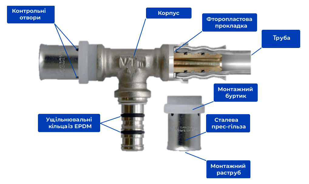 • Тривалий експлуатаційний термін. Більшість європейських виробників на прес-фітинги зазвичай надають 50-річний гарантійний період за умови, що встановлення було виконано правильно.