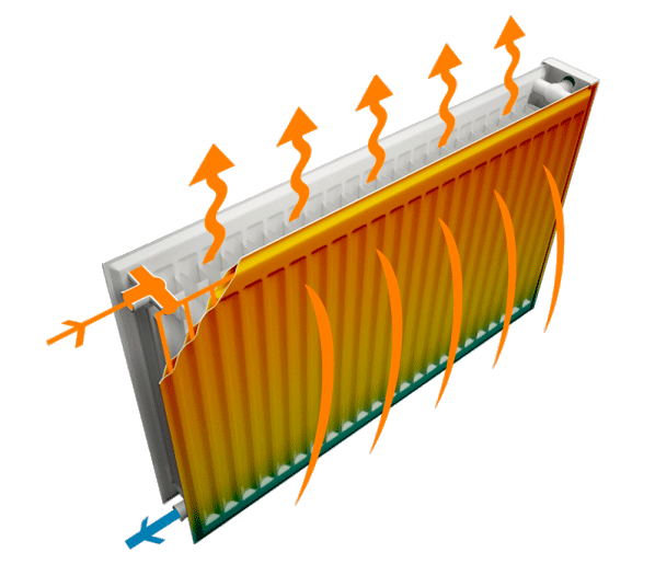 У сталевого радіатора приблизно 50% енергії, що передається в приміщення, припадає на теплове випромінювання бічною поверхнею і близько 50% припадає на конвекцію. Прохолодне повітря затягується знизу і виходить через верхні отвори вже нагрітим. Додаткові внутрішні пластини конструкції дозволяють спрямовувати повітряний потік.