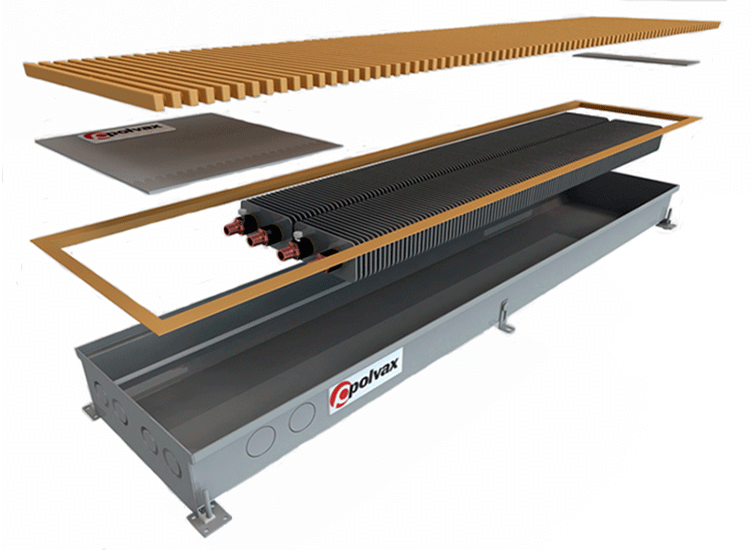 Конвектори Polvax з природною конвекцією знаходять застосування як єдине джерело системи опалення для сухих приміщень з потребою в обігріві панорамного скління, або в комбінації з іншими опалювальними приладами для відсікання холодного повітря від панорамних вікон, засклених балконів або лоджій, а середня глибина короба стяжки підлоги зі стандартною висотою.