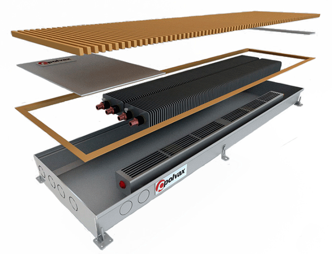 Внутрішньопідлогові конвектори з примусовою конвекцією Polvax KVM 360.Mini – це елемент опалення радіаторного типу з двома теплообмінниками та плавним регулюванням швидкості обертання вентилятора. Внутрішньопідлогові конвектори з вентилятором мають подвійну площу тепловіддаючих алюмінієвих пластин теплообібника, що значно збільшує теплопродуктивність, а високий ККД двигуна дозволяє отримати високу теплову потужність (на 200-250% більше, ніж з природною конвекцією). Конвектори Polvax KVM знаходять широке застосування в системах централізованого або індивідуального опалення для монтажу в приміщеннях з великою площею скління або низьким підвіконним простором.