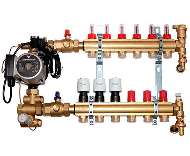 - Колектор теплої підлоги з витратомірами Danfoss FHF (від 2 до 12 виходів);