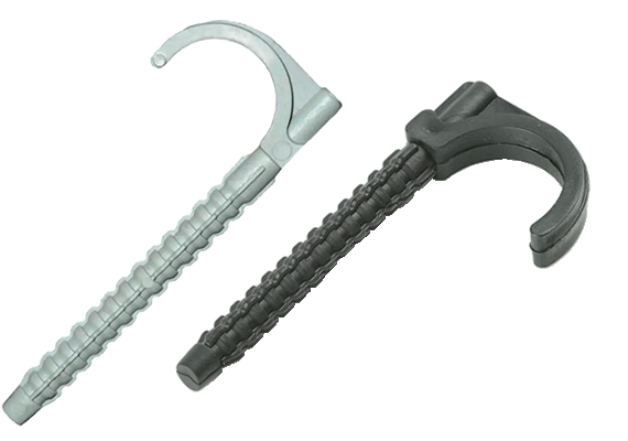 Монтаж гака проводиться в бетонну основу, попередньо просвердлений отвір діаметром 8 мм. Дюбель накладається поверх труби і забивається в бетонну підлогу або стіну, фіксуючи таким чином труби опалювальних або водопровідних систем.